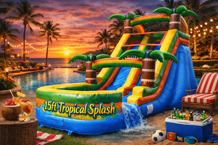 Bring a slice of the islands to your event with the 15 feet Tropical Paradise. This bright, eye-catching waterslide creates an instant party atmosphere with colorful tropical graphics and plenty of space for kids to climb and splash into the pool area. At roughly 15 feet, it’s compact enough for most yards yet roomy enough to entertain a small group. Durable, easy to set up, and suitable for birthday parties, luaus, school events, or backyard gatherings, this bounce provides safe, bouncy fun and a festive look that complements summer- and island-themed celebrations.